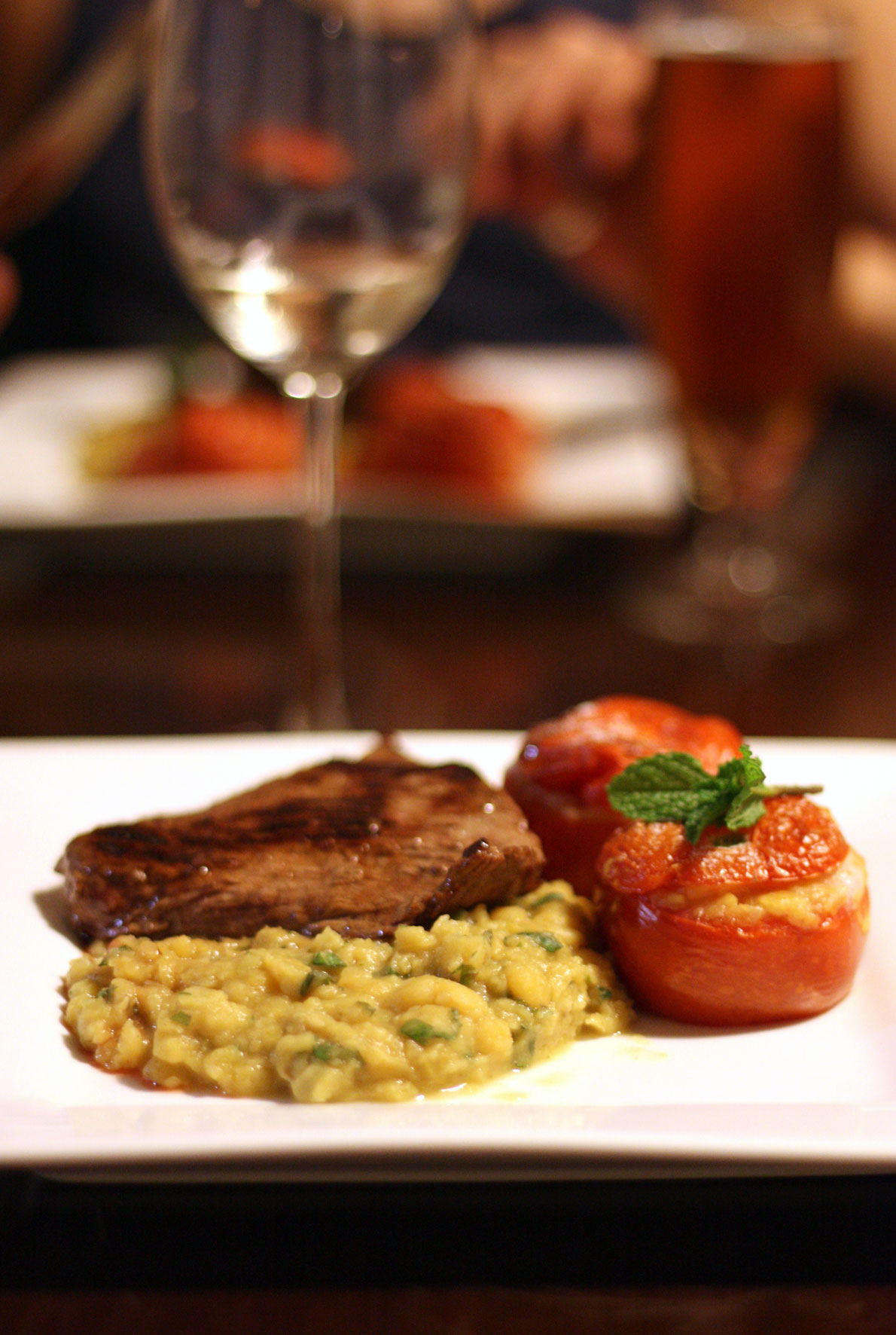 This was some kind of yellow split pea concoction with tomatoes stuffed with yellow split peas and served with Kangaroo steaks.