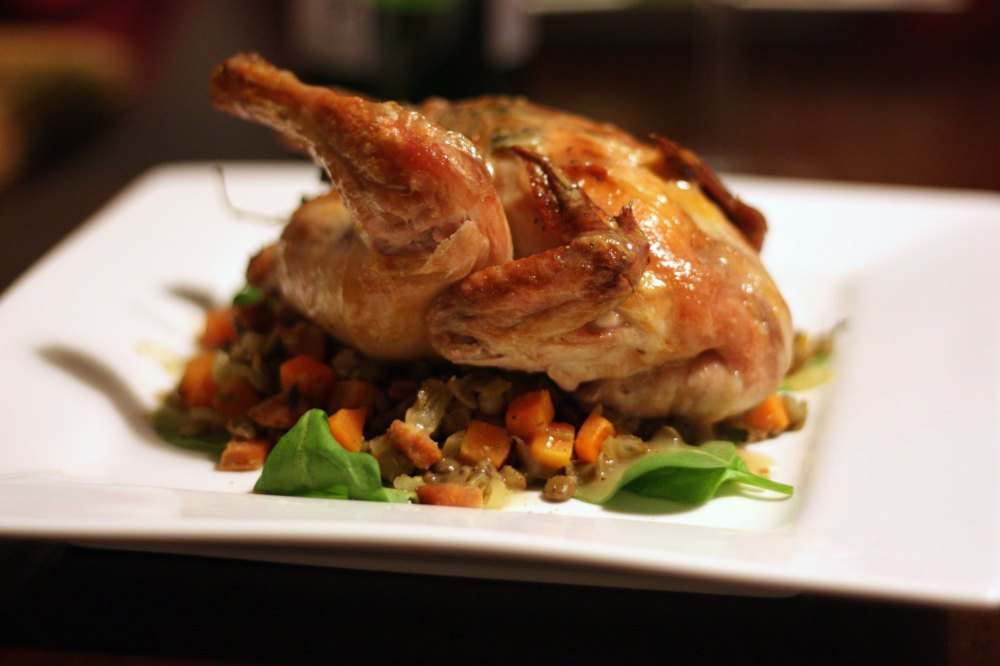 Sautee garlic and onion in a dash of olive oil then add carrot and sautee for a minute or two longer. Add Chicken stock and bring to a simmer. Add thyme and simmer until carrot is just done and stock has reduced. Add lentils and stir through. Serve on a bed of english spinach topped with the roast spatchcock.