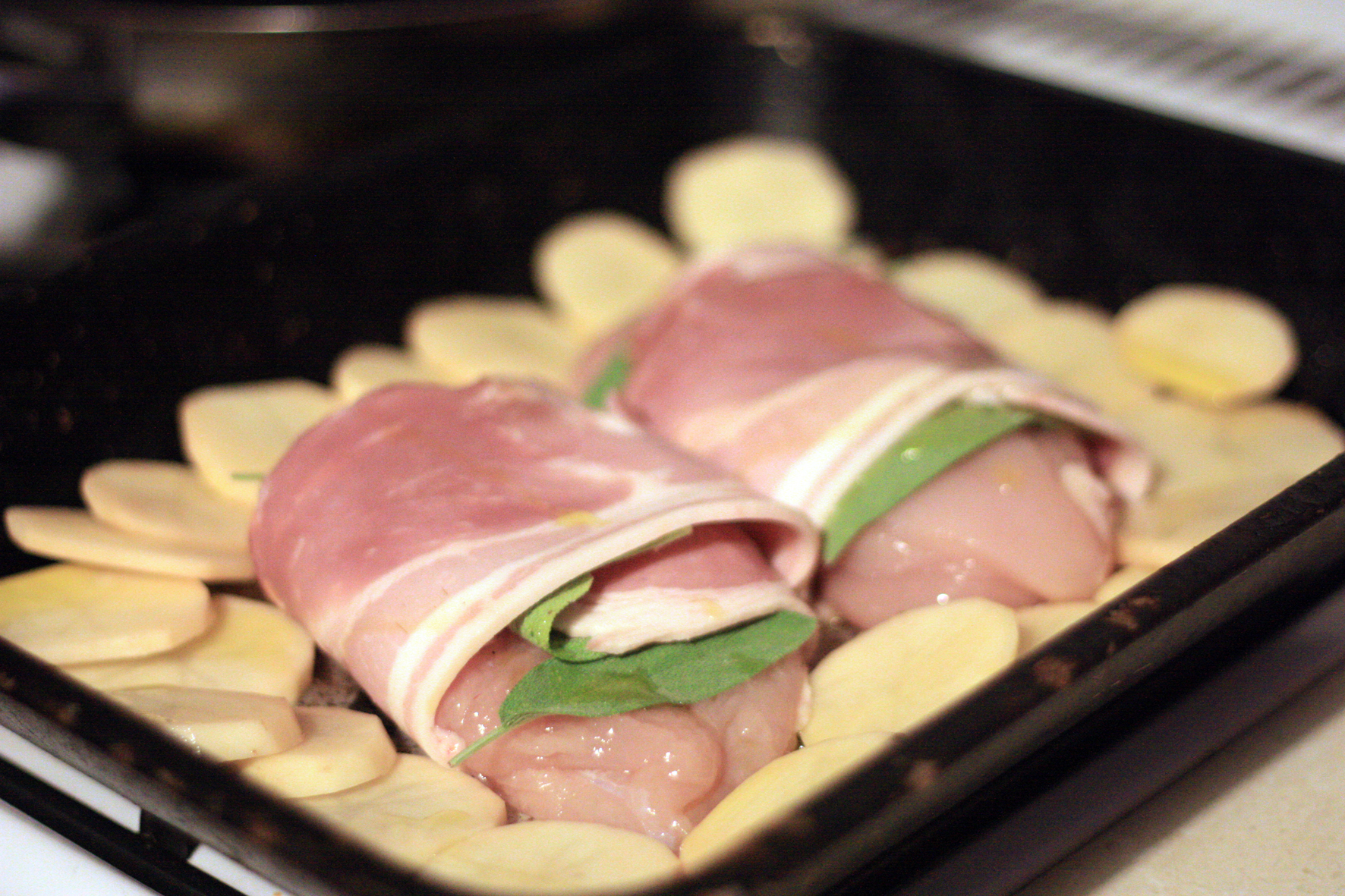 Simply layer the sage on top of each chicken breast half then wrap with bacon and place in the centre of a baking dish. Place sliced potato around the outside, drizzle with olive oil and roast for about 30-40 mins on 200ºC or until chicken is ‘just’ done.