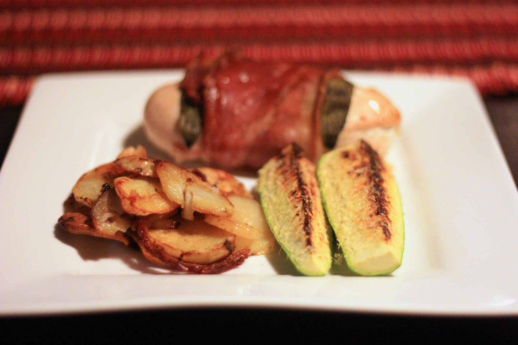 This one was a pretty easy, leave-to-cook option for a weeknight. Chicken, sage and bacon baked with thin potato rounds and served with grilled zucchini topped with parmesan cheese.