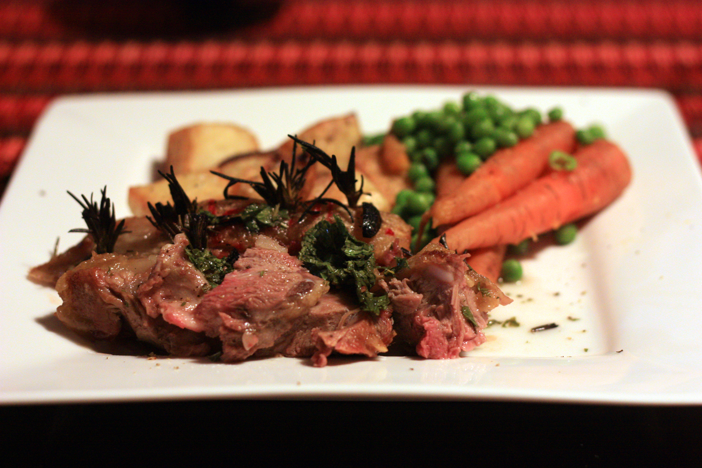It’s wet and cold and miserable and that means loafing about in my PJs making roast lamb. I did this one fairly traditionally with the obligatory garlic and rosemary, home made mint sauce, roasted potato and steamed baby carrots and peas. I don’t think I really need to write out a recipe for this whole meal other than to mention that I cooked the lamb for 1 hour at 200ºC then let rest for 15 minutes.