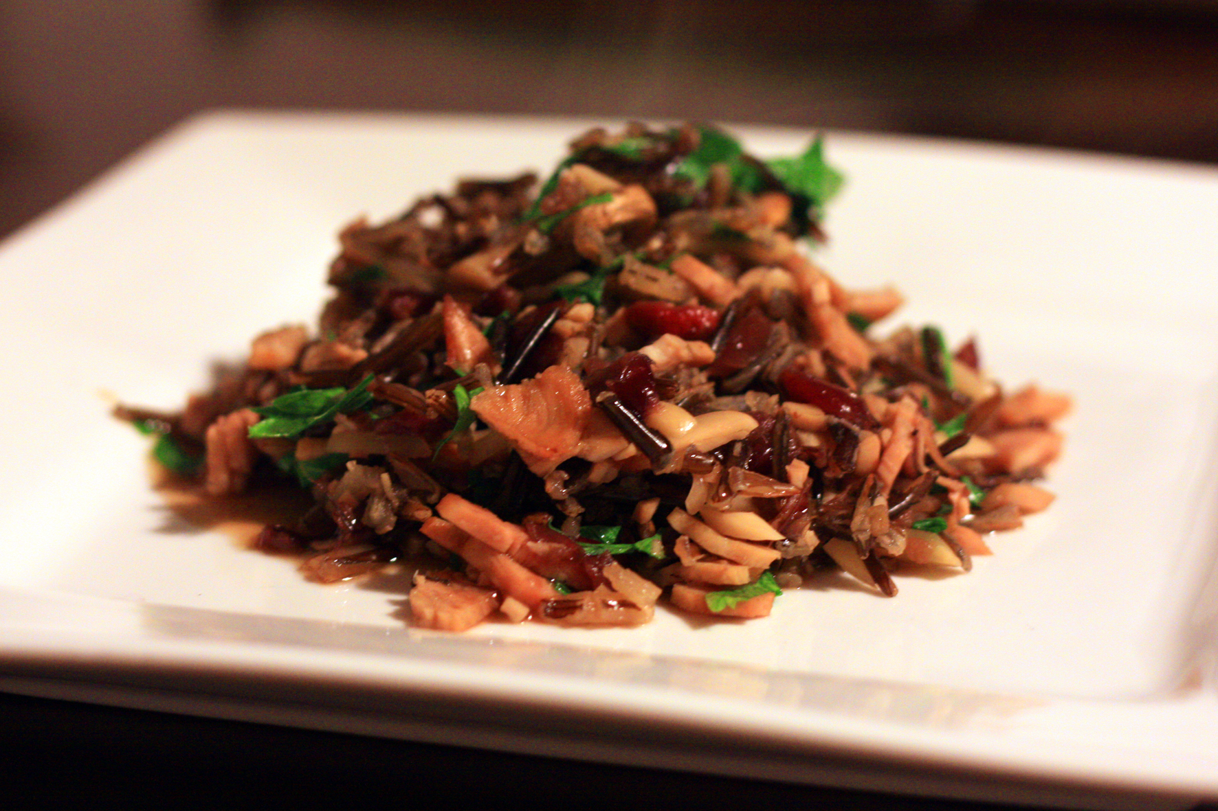 I’ve been having a hankering for wild rice. I absolutely love the texture of it and it’s so good for you. I also love the flavour of nuts and raisins in food which are common in various Moroccan dishes. The sweet and savoury flavours are accentuated by the soft and crunchy textures. In trying to keep this healthy I chose to use turkey breast which is fairly low in cholesterol so craisins (dried cranberries) seemed like a logical addition to this dish. For two people the recipe is as follows.