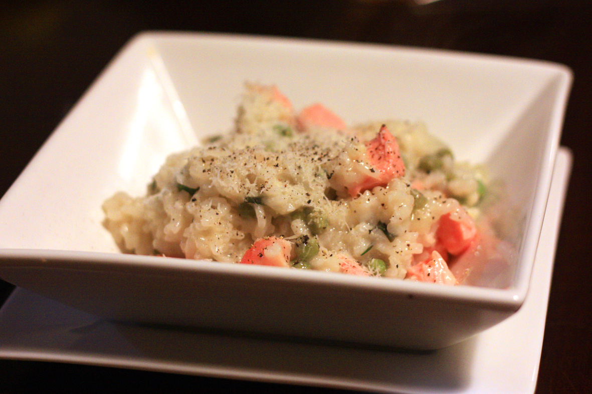 Sauté onion, lemon zest and garlic in olive oil for a minute or two on medium head then add rice and fry gently until all rice is coated with oil. Now start adding the lemon juice and fish stock little by little stirring as you go until rice has absorbed all of the liquid. At this stage add in the peas until they are done. Once the rice is ready stir in the butter as the rice will look shiny, then add parmesan, diced ocean trout and parsley and serve with pepper and extra parmesan. No need to keep cooking as the heat in the rice will cook the ocean trout enough.