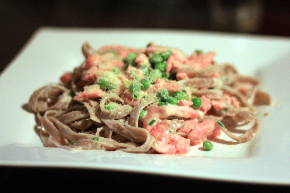 Boil spelt pasta until al dente then drain and put back into pan with heat turned off. Quickly add ocean trout as it is merely the steam and heat from the pasta that will cook this lightly. Also put in lemon zest, parmesan, olive oil, lemon juice, chilli, peas and olive oil. Stir gently until well mixed and serve with extra parmesan and cracked pepper.