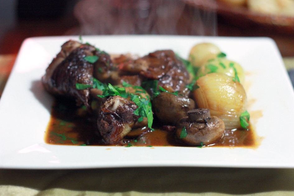 Veggie stock, red wine, lots of garlic, olives, oxtail, onion, carrot. 3 hours braising. Eating it tonight!