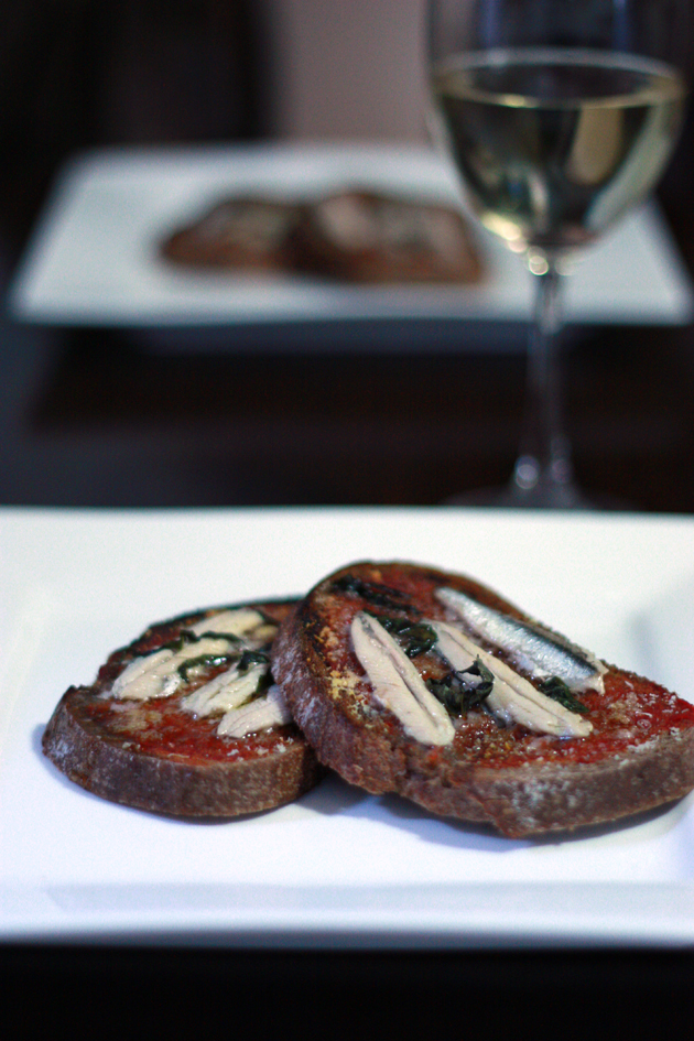 Spread tomato paste on bread, coat with parmesan, top with anchovies, basil and olive oil and place under a hot grill until done. I’m a huge fan of anchovies. Will definitely be making this again.