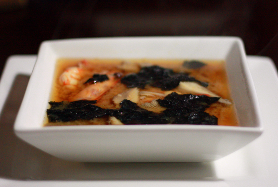 Bring water and dashi stock to a simmer dissolving the miso as you go. Add in prawns, prawn heads and mushrooms and simmer until the prawns and mushrooms are ready to eat. Remove prawn heads and serve in bowls sprinkling seaweed in as you serve.
