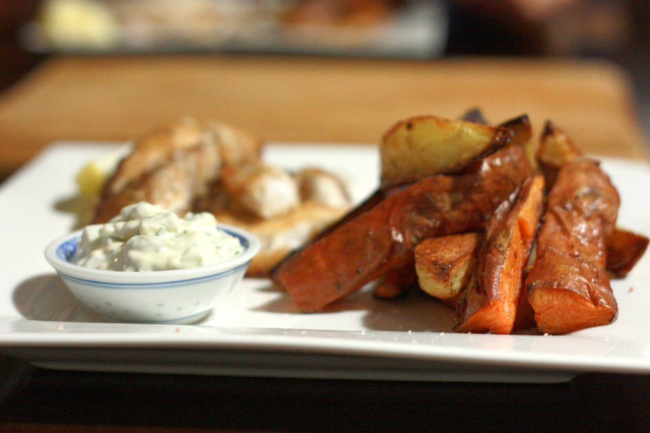 I’m loving doing variations on fish and chips at the moment. Basically I’m a sucker for a great piece of fish and cooked potato. Where can you go wrong? In the aim of keeping to a slightly healthier option I did mostly sweet potato chips with this one.