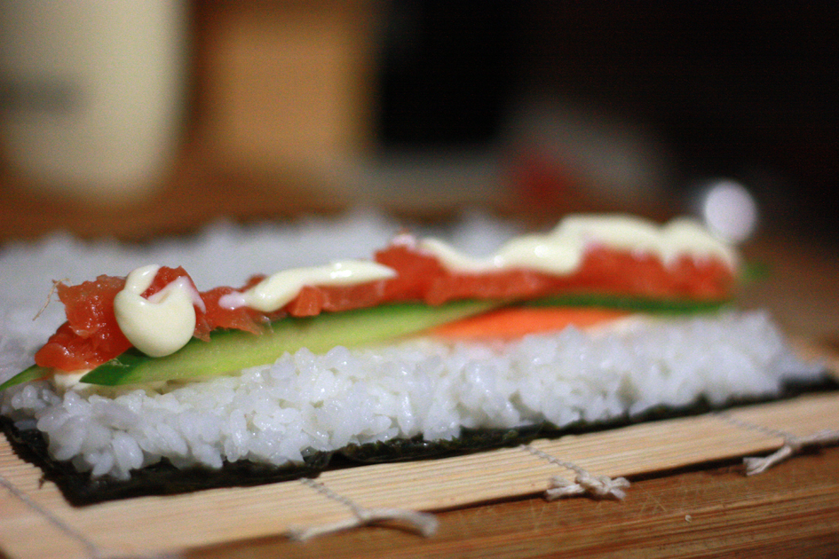 Once the rice is ready and cooled I lay down a single sheet of seaweed and spooned the rice over in a thin layer leaving about 1/3 of the sheet free of rice. Then near the edge that has the rice nearest the edge I lay down thin strips of carrot, cucumber and salmon. Top this with a thin strip of Kewpie mayo and use the rolling mat to roll tightly around until completely rolled. I then repeated this process with cucumber only and carrot only until I had two thin rolls and one thick roll. Wrap these in glad wrap and place in the fridge for about 20 minutes then slice about 1.5-2 cm thick with a wet sharp knife.
