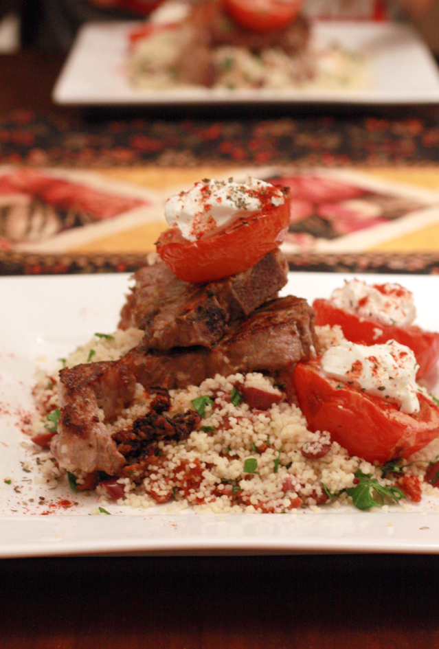 First I put the lamb in a bowl to marinate and the tomatoes in the oven on about 160ºC to roast just a little. I left them in for about half an hour and while I did this I put one cup of couscous in 1 cup of boiling water and waited until it had expanded then fluffed with a fork. In the meantime I had chopped up about 1/4 cup of semi sun dried tomatoes, 1/4 cup kalamata olives and 1/4 cup of fresh flat leaf parsley. I mixed all this through the fluffed couscous then put the lamb in an oiled fry pan on a medium heat for about 3 minutes each side. Once ready I served the couscous topped with the lamb loins, the roast tomato, labneh and a sprinkle of paprika.