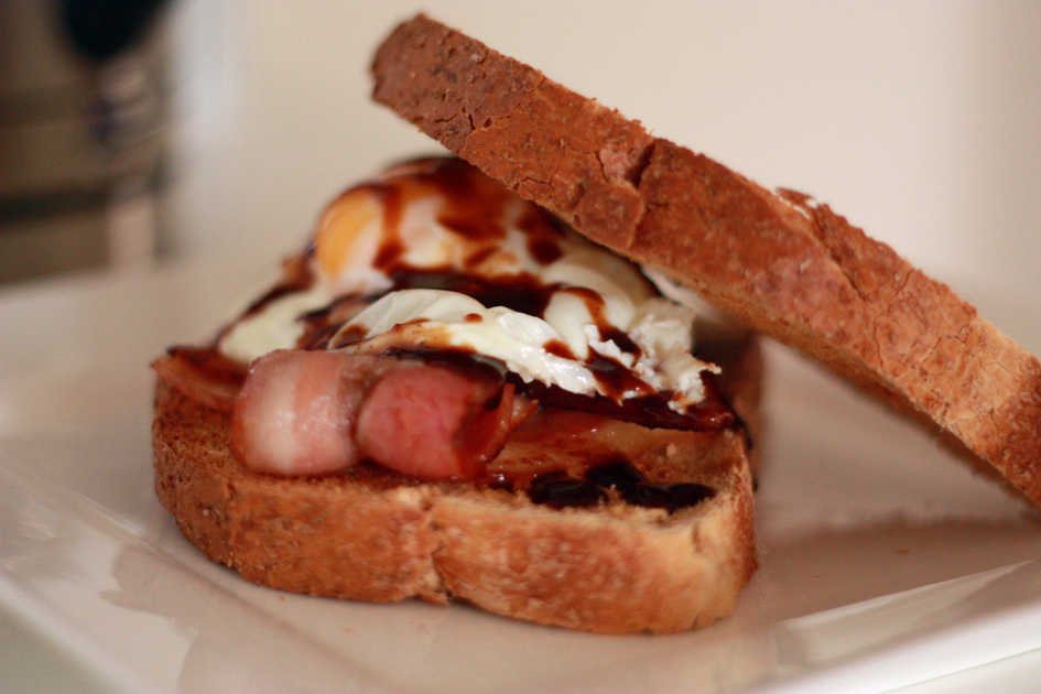 Keeping it simple here with a spelt bread, bacon, fresh eggs and BBQ sauce sandwich.
