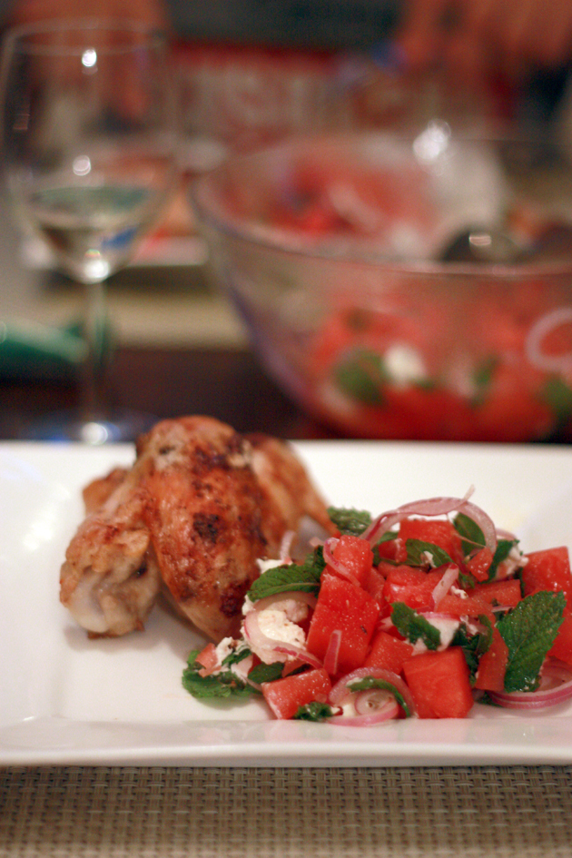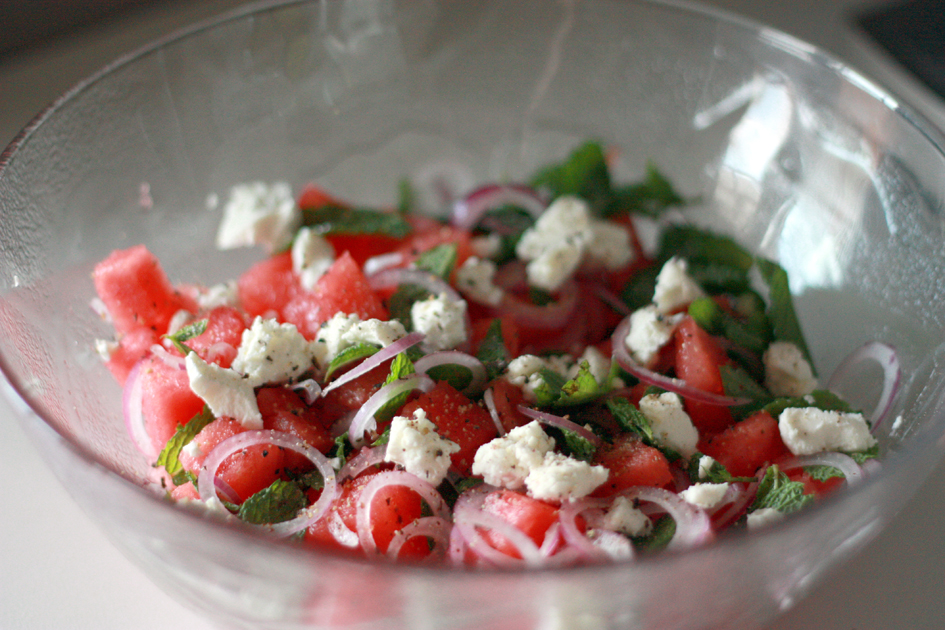 I’m loving the use of fruits in salads at the moment. We had the pleasure of ducking away to seeing the Taller half’s mum and husband on the weekend. They live on a lovely property in the Manning Valley with a marvelous vege garden and an orchard to yearn for. We scored ourselves half a watermelon and after the long drive home on Sunday (after a weekend of eating and lazing about) I wanted to make something quick and light.