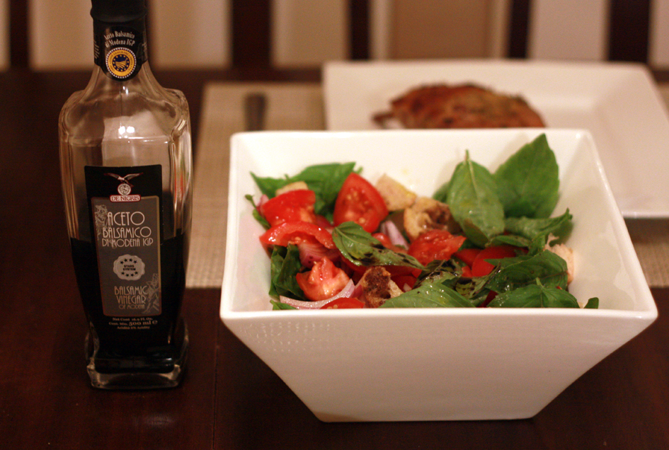 Now depending on how stale your bread is (mine was like a rock) you might want to make this in two stages. First I added the tomato, bread and onion into a bowl and drizzled well with olive oil, leaving for a while so the oil and tomato juice can soak into the bread and soften it up a little. When I’m ready to serve I add the basil and salt and pepper and toss well. Then I drizzle again with a little olive oil and some balsamic. The bread should have softened a little but still have some hard bits giving them a toasted crouton like quality… great for soaking up all the juices in the salad… or on your plate.