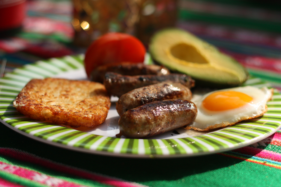 Beef chipolatas with hash browns, avocado, eggs and tomato
