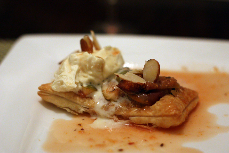 Once the pastry is read place it on the plate, top with the figs (removed from syrup), cream, almonds then drizzle the rest of the syrup over the top. If the syrup is very runny just simmer it with the lid of for a short time until it begins to thicken.