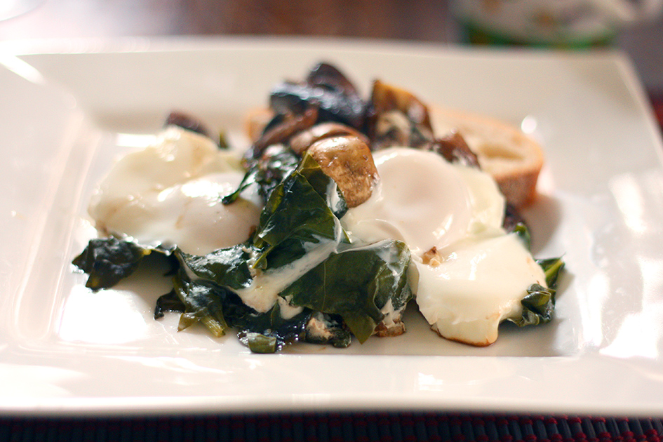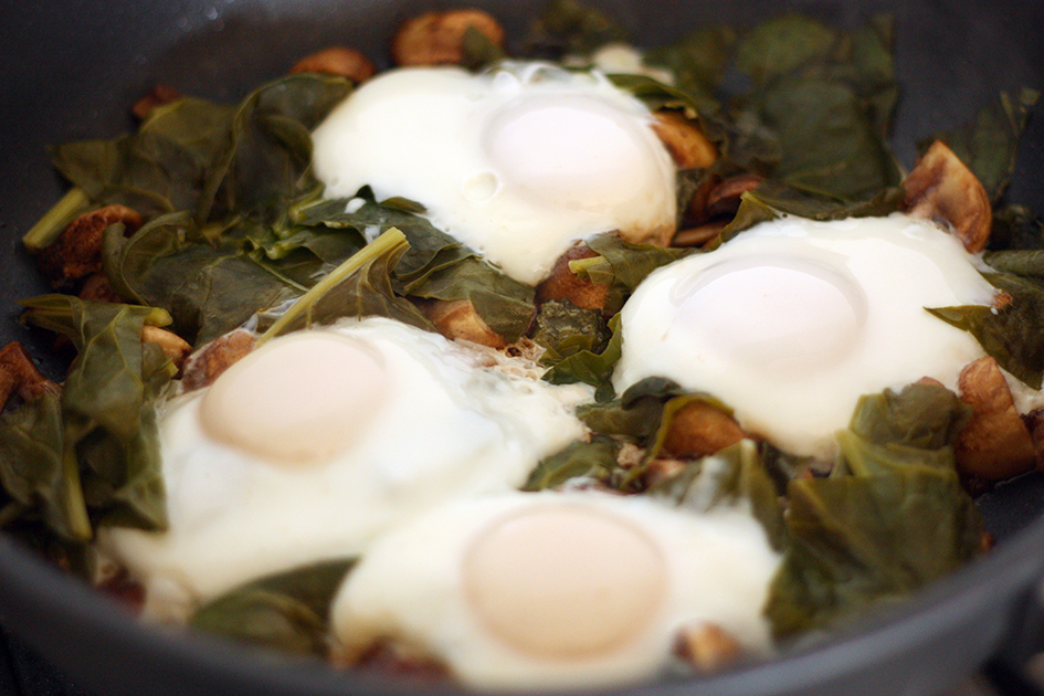 Add spinach and sauté until it begins to wilt then crack four eggs over the top and cover with a lid so the liquid from the mushrooms and spinach steams the eggs.