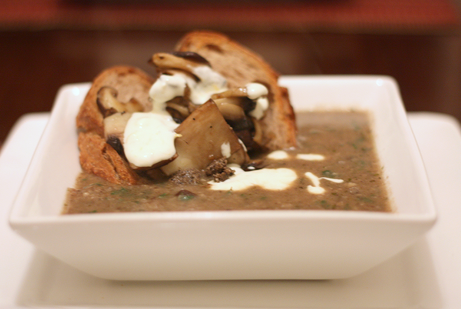 Add the zest and juice of half a lemon to a couple of tablespoons of greek yoghurt. Add the parsley to the soup, stir then serve with a couple of slices of toasted good quality bread, the sautéed mushrooms, a dash of truffle paste and the yoghurt mixture.